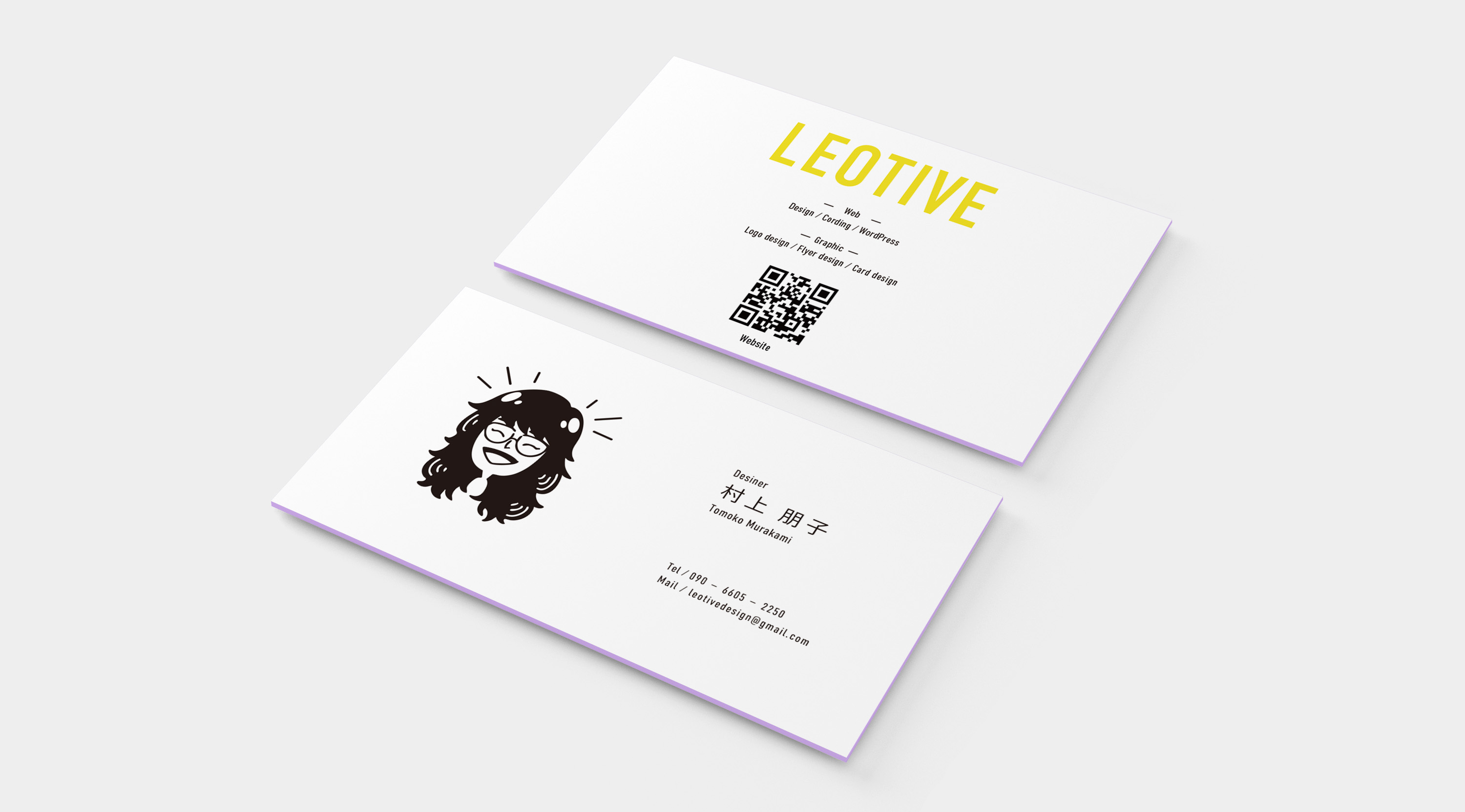 ブランドカラーのイエローをロゴに使用し、視認性と印象づけを意識したデザイン。 自身の似顔絵を取り入れることで、親しみやすさを演出するとともに、顔と名前を覚えてもらいやすくし、認知度の向上を狙いました。 印刷には活版印刷を採用し、独特の凹凸感と手触りにより、名刺全体に上質で記憶に残る印象を与えています。