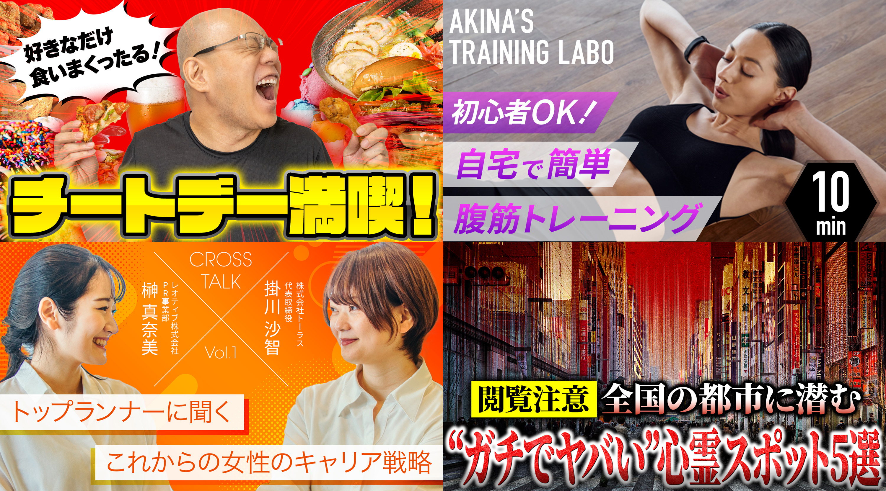 | 左上 | エンタメ | 20代〜30代男性 | ジャンクフードを食べている男性の背景に、さらにジャンクフードを並べてチートデー感を出しました。赤ベースの背景にすることで食欲が出そうな雰囲気を出しています。 |